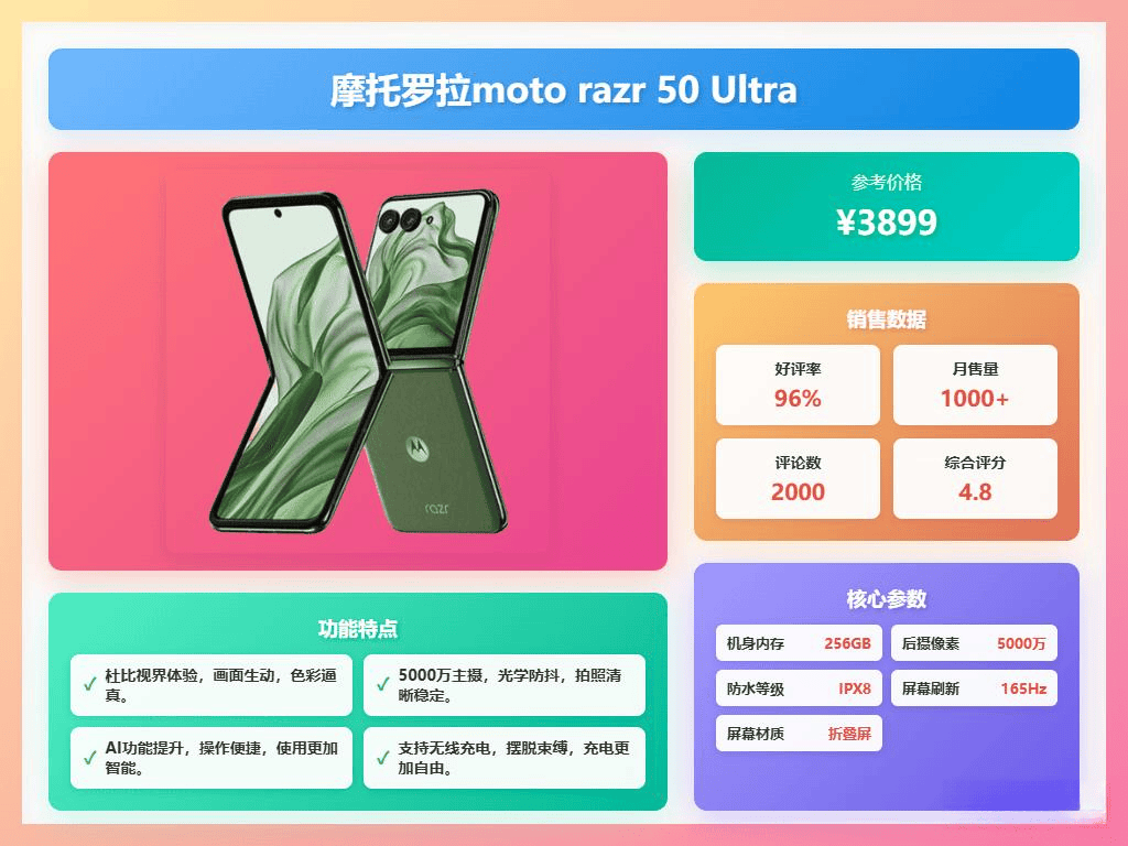 1. 无界折叠屏:摩托罗拉moto razr 50 Ultra采用第五代折叠屏技术,内外屏都大且顺畅。