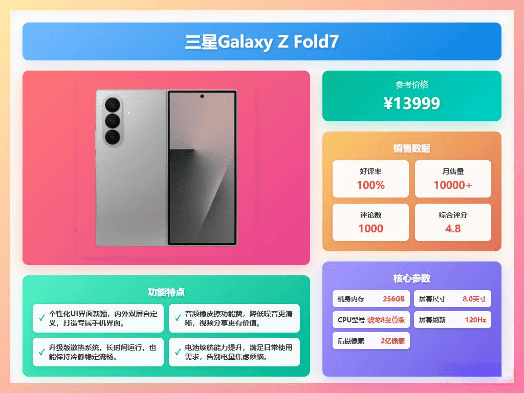 2. 大屏沉浸体验:8.0英寸的折叠主屏幕,视野开阔,操作流畅,适合观看视频和玩游戏。
