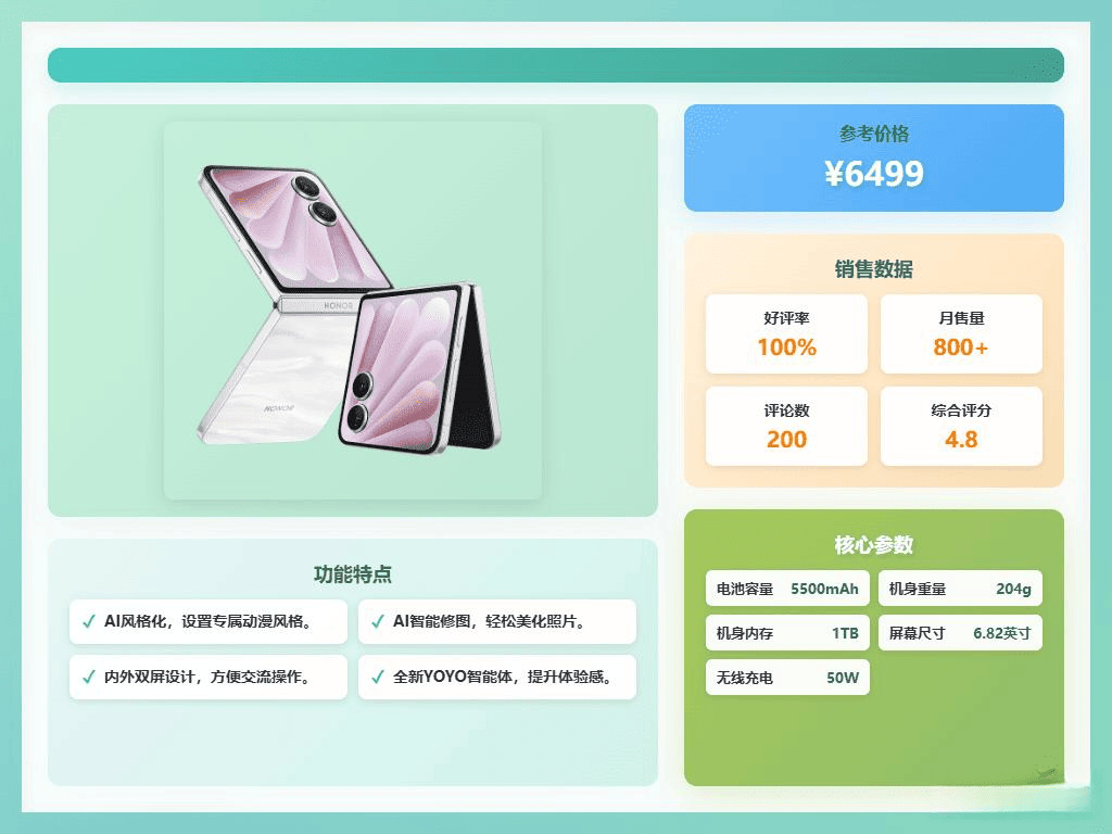1. 折叠屏设计:荣耀Magic V Flip2采用柔性折叠屏设计,体积小巧,方便携带,打开后享受大屏体验。