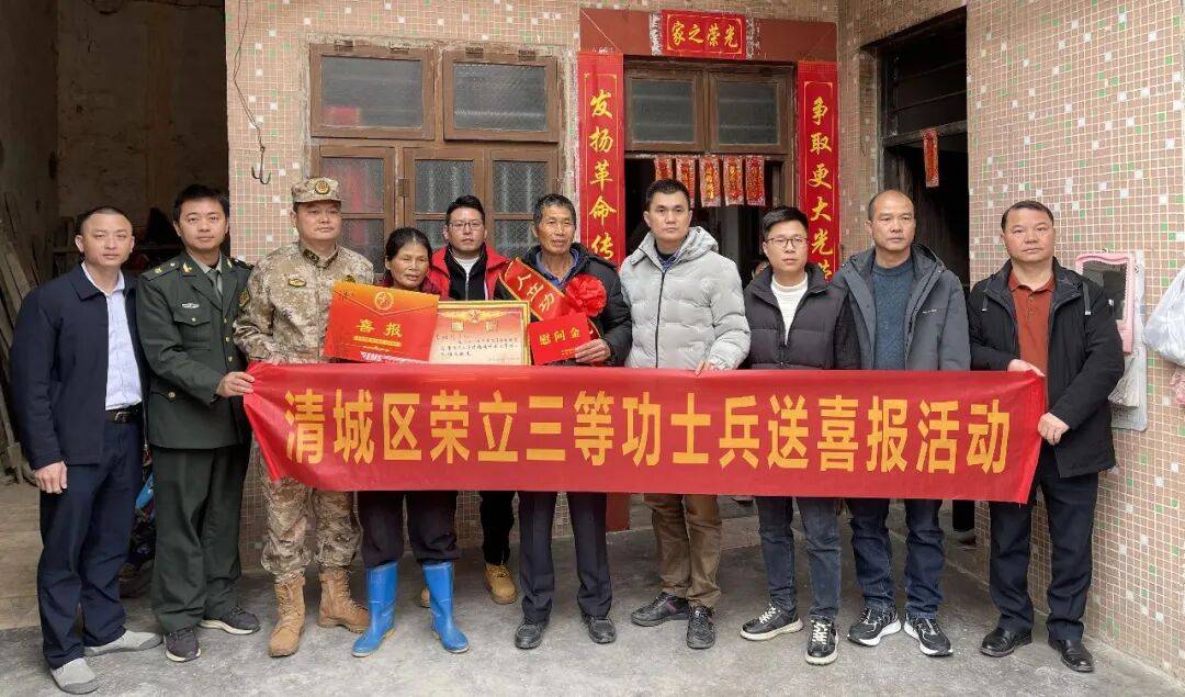 △2025年2月,清城区退役军人事务局、区武装部联合源潭镇武装部、镇退役军人服务站和清远市暖阳社会工作服务中心为荣立三等功现役军人李健明家属送去立功喜报。