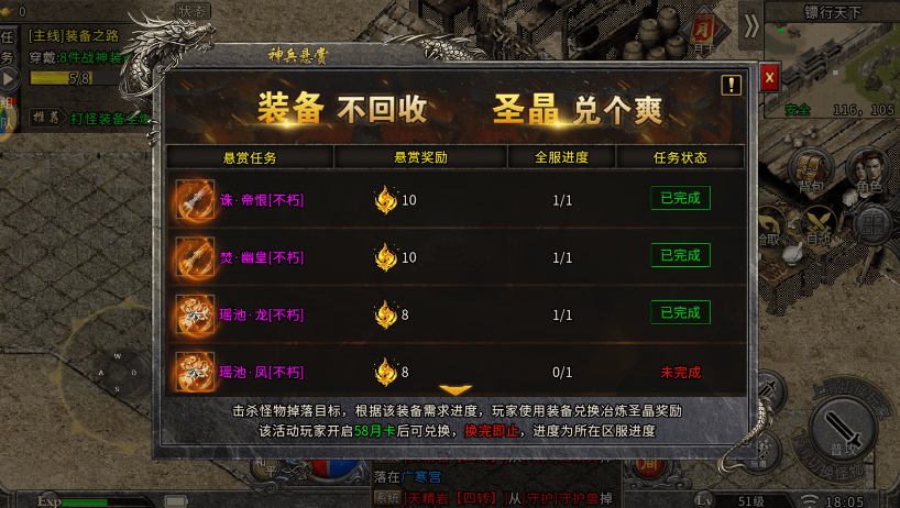进阶地图(31-60级):冰封矿洞、幽冥回廊、狂徒之家,怪物强度适中,掉落1-3转材料、蓝装与大量元宝,适合中期冲级与材料积累,散人玩家可在此长期挂机。