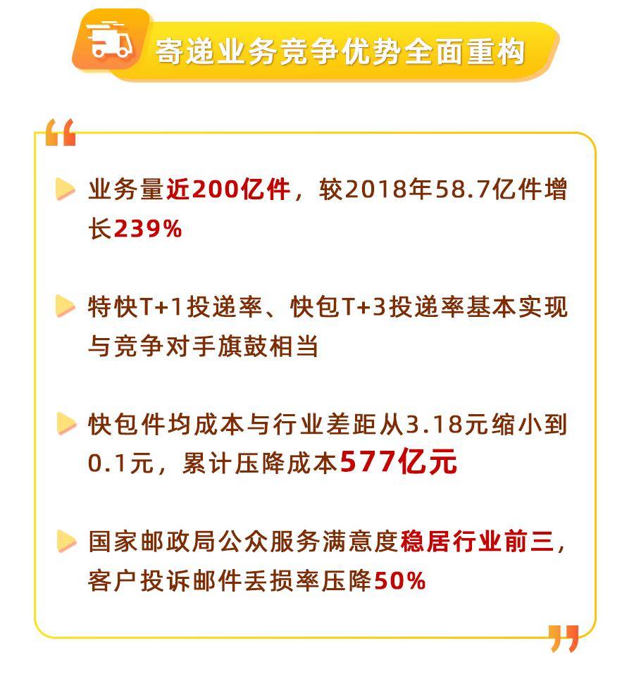 全年业务量近200亿件,较2018年的58.7亿件增长239%;快递进村业务量从 2021年的11.76亿件飙升至68亿件,显示了“国家队”在下沉市场的深度布局与绝对优势。