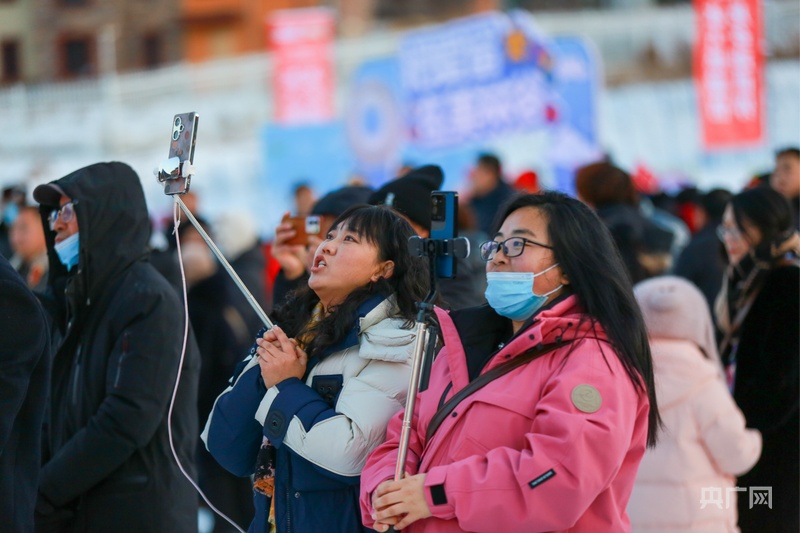 “美食市集”香气四溢,牛营子药乡药膳药茶、喀喇沁王府烤肉等特色美食齐聚,让现场观众大快朵颐;凿冰取宝、打靶、手工制作等互动游戏区域人头攒动,3米长的透明冰台内藏着龙马主题礼品、赤峰特色纪念品,游客们手持安全冰镐凿冰寻宝,沉浸式体验冰雪乐趣;雪人、网红打卡墙前,市民游客纷纷驻足拍照……