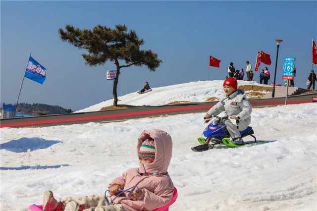 “第一次见到海边的冰雪乐园,一边玩雪一边看海,景色绝了,项目也多,孩子玩得特别开心,年味和浪漫都拉满了!”来自江苏的游客张女士对此次威海之行赞不绝口。除了冰雪乐园,火炬八街新春氛围十足。街区亮化美化全面升级,8娃8宝等花灯璀璨夺目,与滨海风光相映成趣;舞龙舞狮、火壶、汉服秀、街头音乐会轮番上演,非遗购物节同步开启,传统文化与新春烟火气交融,持续聚拢人气。